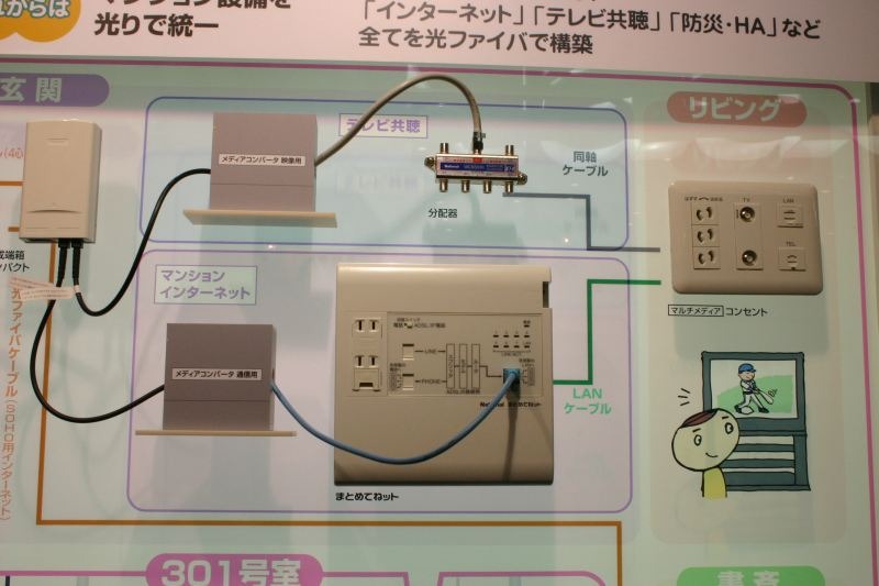 FOE2007において、松下電工は、電話やACコンセントと同じように一般の住宅にも光コンセントを設置するための器具や施工例をパネルでわかりやすく展示していた。