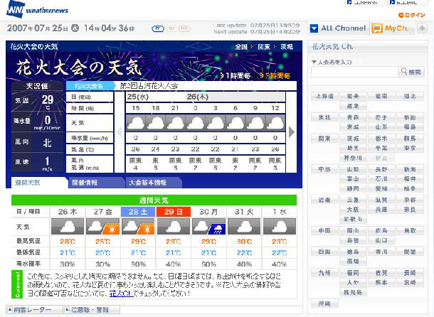 総合気象サイトのウェザーニュースが、「花火天気Ch.」をスタート。全国1000ヵ所の花火天気情報のほか、大会のアクセスや見所、気象予報士による“予報士コメント”もチェックできる。