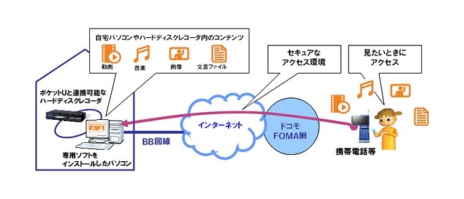 NTTドコモは22日、自宅のPCに保存してある動画、音楽、画像、文書ファイルなどに携帯電話からアクセスして、視聴・閲覧できるサービス「ポケットU」を6月6日より開始すると発表した。