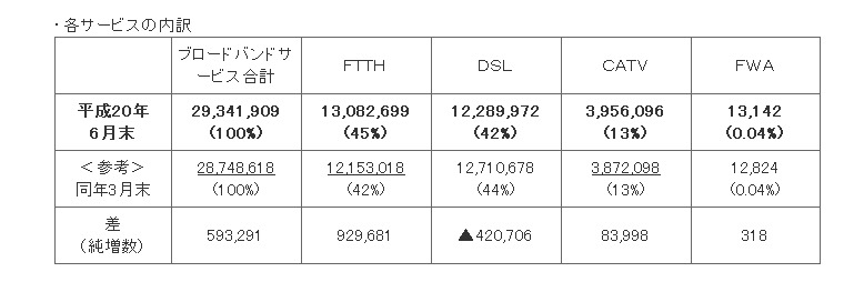 総務省は17日、電気通信事業報告規則(昭和63年郵政省令第46号)の規定に基づき、電気通信事業者から報告のあった2008年(平成20年)6月末時点のブロードバンドサービスの契約数等について公表した。