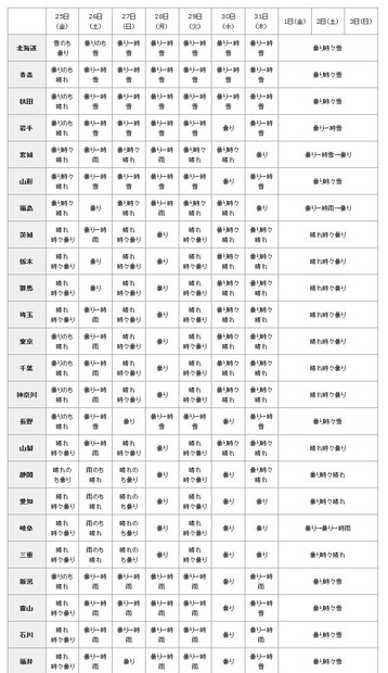 ウェザーニューズは24日、25日から2010年1月3日までの年末年始天気傾向を同社のサイトで発表した。帰省時は、時間に余裕を持って出発した方がよさそうだと予想。