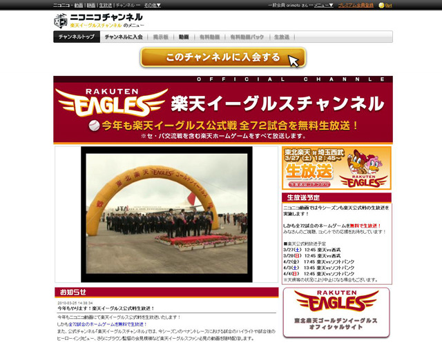 「ニコニコ動画」の「ニコニコ生放送」では、プロ野球チーム、東北楽天ゴールデンイーグルスの公式戦72試合をライブ配信する。