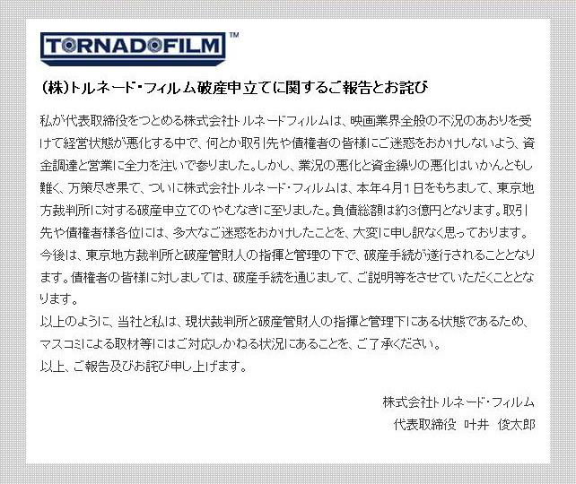 「だめんず・うぉ~か~」などで知られる漫画家・倉田真由美の夫で、2001年にフランス映画「アメリ」を買い付けてヒットさせた叶井俊太郎氏の映画配給会社「トルネード・フィルム」が破産申請を行った。