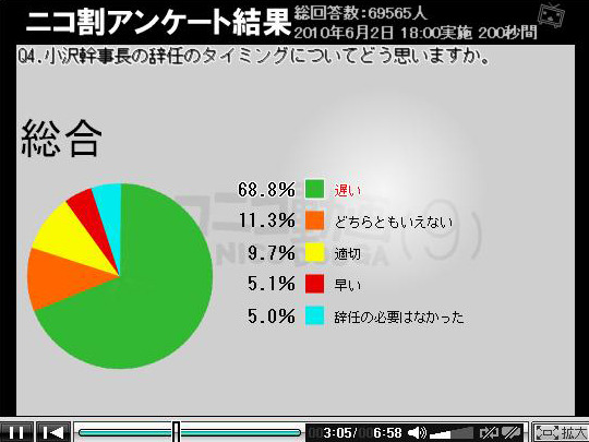 「ニコニコ動画」が意識調査「鳩山首相、小沢幹事長の辞任について」を実施。調査日は6月2日18時00分から約200秒間。その間に69,565件の回答が寄せられた。