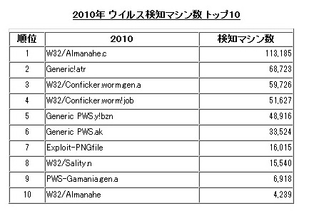 マカフィーは14日、2010年のコンピュータウイルス、不審なプログラムの検知データの集計を発表した。