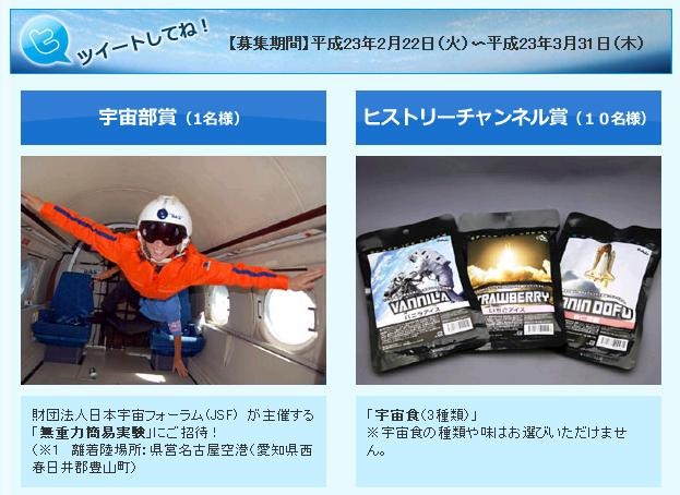 CS放送の「ヒストリーチャンネル」が「ヒストリーチャンネル宇宙部」を発足。これを記念して「無重力簡易実験」が当たるTwitterを利用した期間限定キャンペーンを行っている。