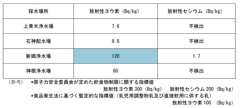 川口市水道局は24日、22日に市内の新郷浄水場から、乳児向けの暫定的な基準値(100Bq/kg)を超える濃度の放射性ヨウ素が測定されたと発表した。