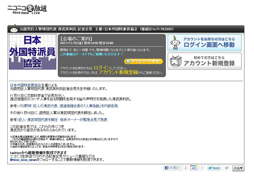 ニコニコ生放送では、本日15時から元読売巨人軍球団代表・清武英利氏の記者会見を生配信する。