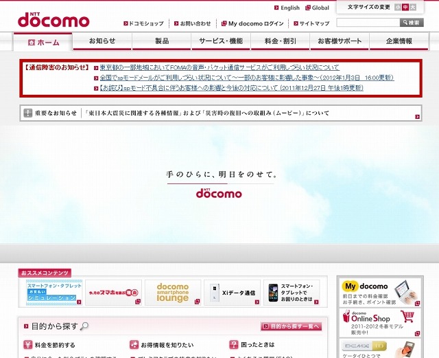 トップページでも障害の発生を告知中