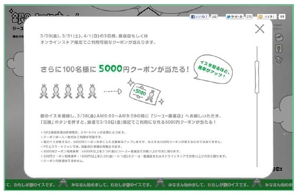ファーストリテイリンググループのブランド「ジーユー」は、3月30日に日本最大級の旗艦店「ジーユー銀座店」をオープンする。これを記念した「銀のイスに座れ!」サイトにて、7日より、SNSと連携した“オンラインイス取りゲーム”がスタートした。