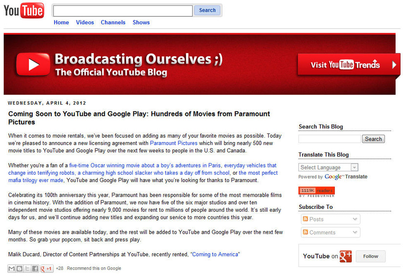 米Googleは4日(現地時間)、パラマウント・ピクチャーズの映画をYouTubeやGoogle Playで配信するライセンス契約を結んだと発表した。近日中に、パラマウントの500本もの映画がレンタル用コンテンツとして配信される。