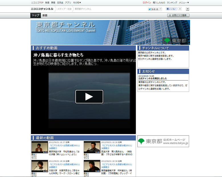 東京都は25日、ドワンゴが運営する動画サイト「ニコニコチャンネル」に、公式チャンネル「東京都チャンネル」を開設した。動画による都政情報の発信に活用していくとしている。