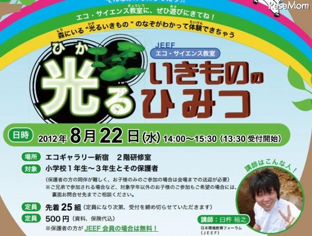 自然体験を通した環境教育に取り組むJEEFは、8月22日(水)にエコ・サイエンス教室「光るいきもののひみつ」を開催する。小学1〜3年生を対象に、主に森に生息する光る生きものについて、クイズや実験を通して学ぶもの。