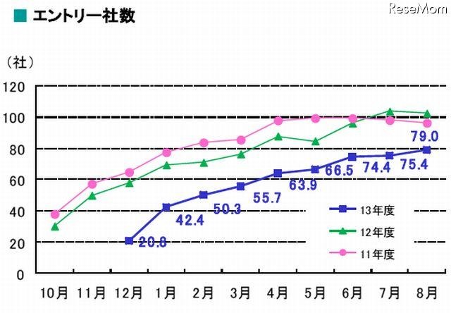 エン・ジャパンは8月24日、2013年度新卒採用について8月度の就職・採用活動のアンケート結果を発表した。学生の平均エントリー社数は79.0社で、企業の37%が採用市況を「前年よりも厳しい」と捉えていることが明らかになった。