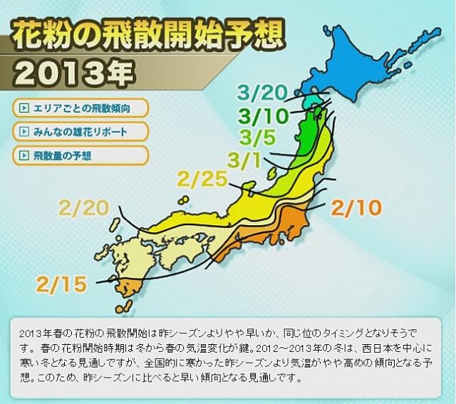 ウェザーニューズは11月29日、2013年の花粉シーズンの「スギ・ヒノキ花粉」傾向を発表した。西・東日本は2月上旬、北日本は2月下旬から飛散を開始すると予想している。