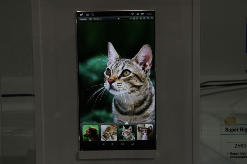 Japan Display(JDI)の展示の目玉は試作段階ながら、1440×2560ピクセルのWQHD、5.4型で543ppiという世界最高クラスの精細度を実現したモバイルデバイス用LCDパネルだ。