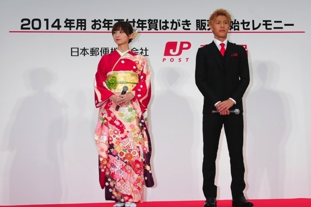 日本郵便が2014年用のお年玉年賀はがきを11月1日に発売した。発売セレモニーを東京・丸ノ内のJPタワー KITTEで開催、イメージキャラクターとしてCMにも出演する元AKB48の篠田麻里子、セレッソ大阪の柿谷曜一郎をゲストに招いた。