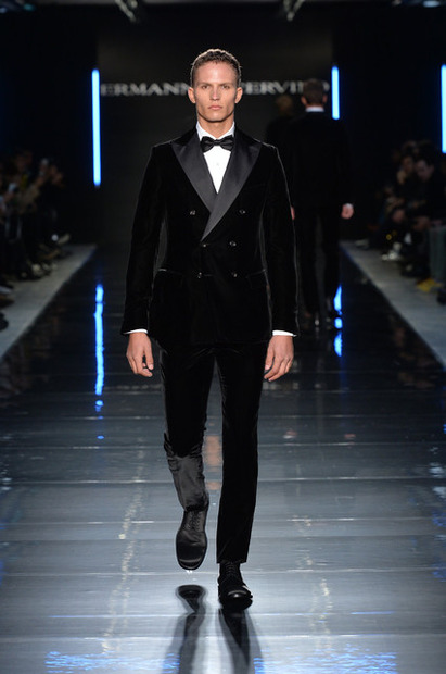 エルマンノ・シェルヴィーノの14-15AWメンズコレクションがミラノファッションウィークで発表された。全体にボリュームを持たせながら、ジャケットはミニマムな丈。汎用性の広そうなイブニングウェアはベルベットや圧縮ウールのチョークストライプスーツで提案された