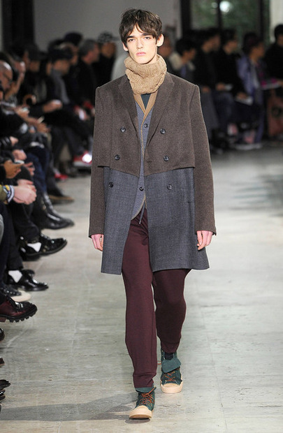阿部潤一による「カラー(kolor)」は、パレ・ド・トーキョーを会場にショーを開催。コートやセーターなど、秋冬用の暖かいイメージの服を、カラーらしい異素材ミックス、カラーコンビネーションで再構築した。