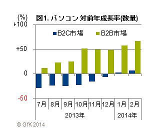 ジーエフケー マーケティングサービス ジャパンは3月26日、パソコンのB2BおよびB2C市場における販売動向を発表した。全国の有力家電・IT取扱店(量販店、専門店、ネット通販等)の販売実績を基に、市場規模相当に拡大推計したものとなっている。