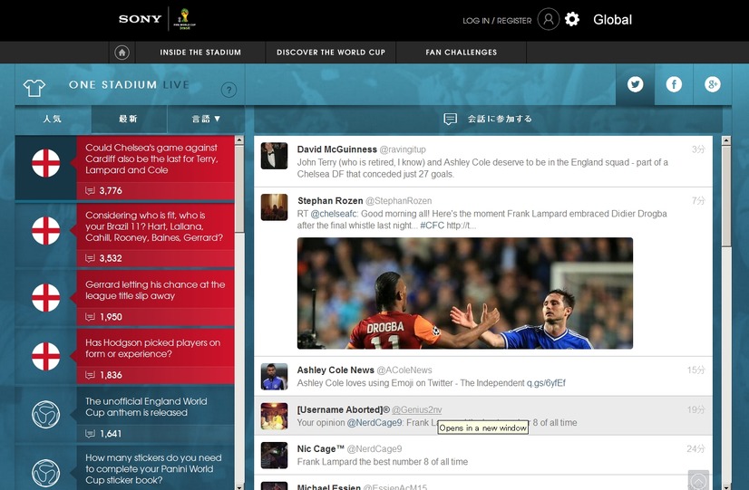 ソニーは12日、2014 FIFAワールドカップに向け、サッカーファンのために開発したSNSサイト「ONE STADIUM LIVE」を公開した。ソニーは、オフィシャルFIFAパートナーを務めている。