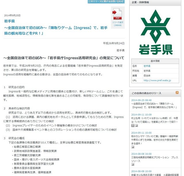 岩手県は、「岩手県庁Ingress活用研究会」を発足させ、第1回の研究会を開催することを発表しました。
