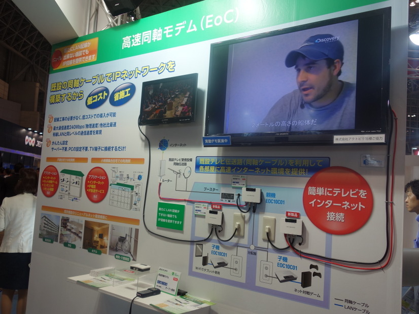 DXアンテナのブースでは既存の同軸ケーブルでIPネットワークを構築できる高速同軸モデムの展示を行っていた。