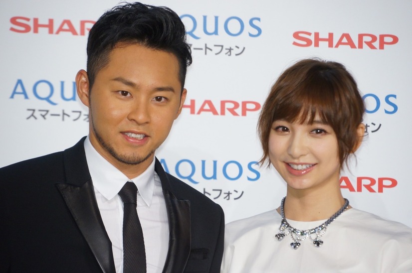 女優の篠田麻里子が6日、水泳選手の北島康介とともにシャープ「AQUOS」WEBプロモーション告知イベントに出席した。