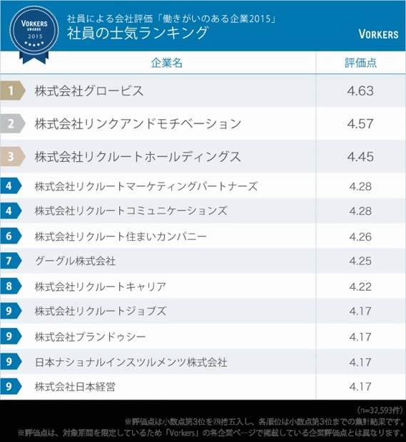 企業リサーチサイトVorkersを運営するヴォーカーズは14日、「働きがいのある企業ランキング2015」を発表した。2013年7月1月~2014年12月31日の期間に、Vorkersに投稿されたクチコミ32,593件をもとに集計を行った。