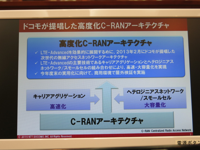 NTTドコモは、2015年3月に「LTE-Advanced」ネットワークの提供開始を予定している。ネットワークを高速化、大容量化し、快適性を向上させることが狙いだが、これらを実現するため、ドコモが検証を進めてきたのが「高度化C-RAN」と呼ばれるネットワークアーキテクチャだ。