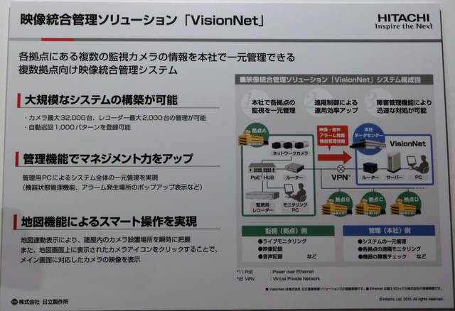 セキュリティショー2015にて、日立グループは少ないデータ容量でHD画質相当の高画質映像を再現可能というネットワークカメラを展示した。