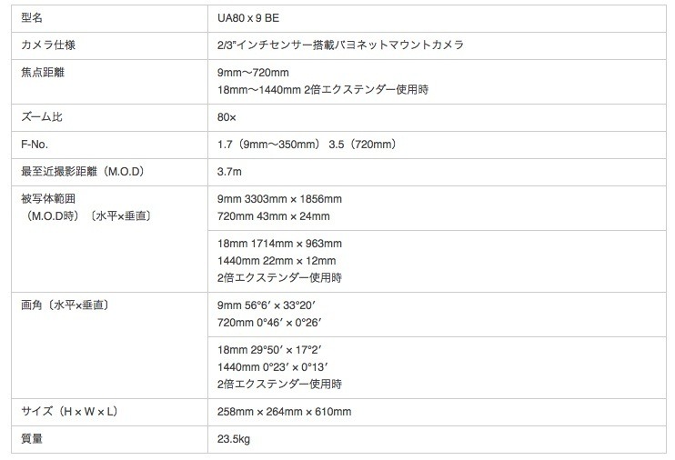 富士フイルムは8日、80倍光学ズームを搭載した4Kカメラ対応の放送用ズームレンズ「FUJINON UA80x9 BE」を7月に発売すると発表した。
