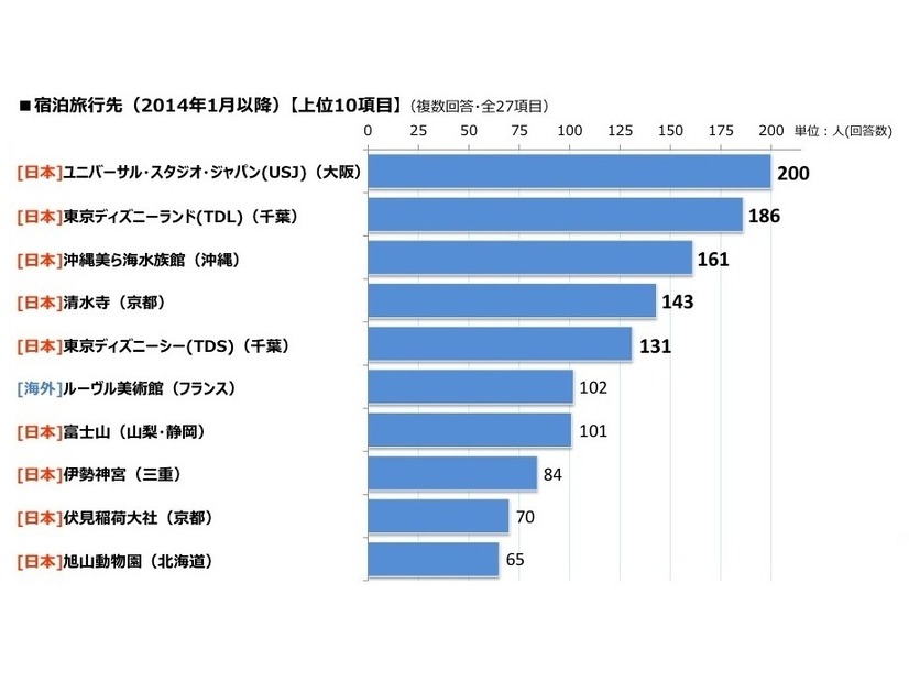 楽天リサーチは「世界の旅行先に関する調査」を実施し、4月20日に結果を発表した。国内外宿泊旅行先として最も多かった旅行先は「ユニバーサル・スタジオ・ジャパン」(USJ、大阪)だった。USJは「満足」「宿泊」「リピート」という設問でも1位となった。