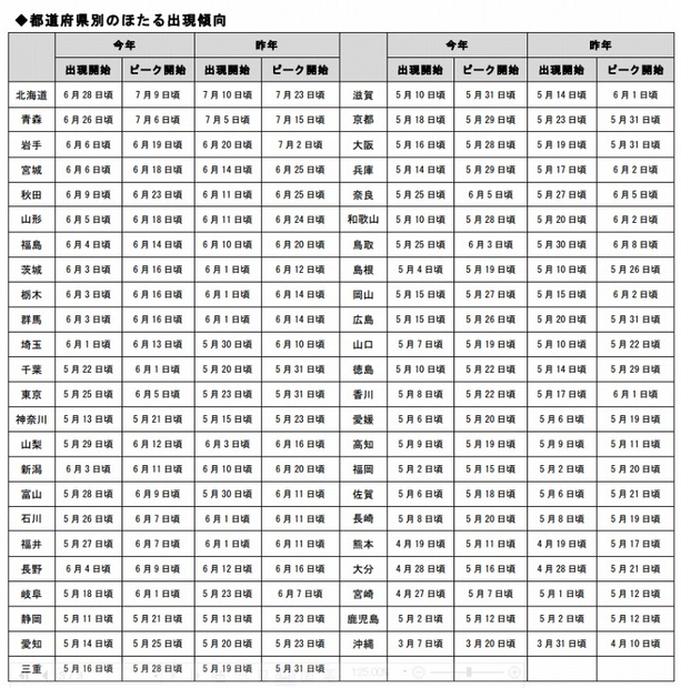 ウェザーニューズは15日、今年のホタルの出現傾向を発表した。春の気温が平年に比べてやや高かったため、全国的に、昨年より早めにホタルが出現すると予測されている。