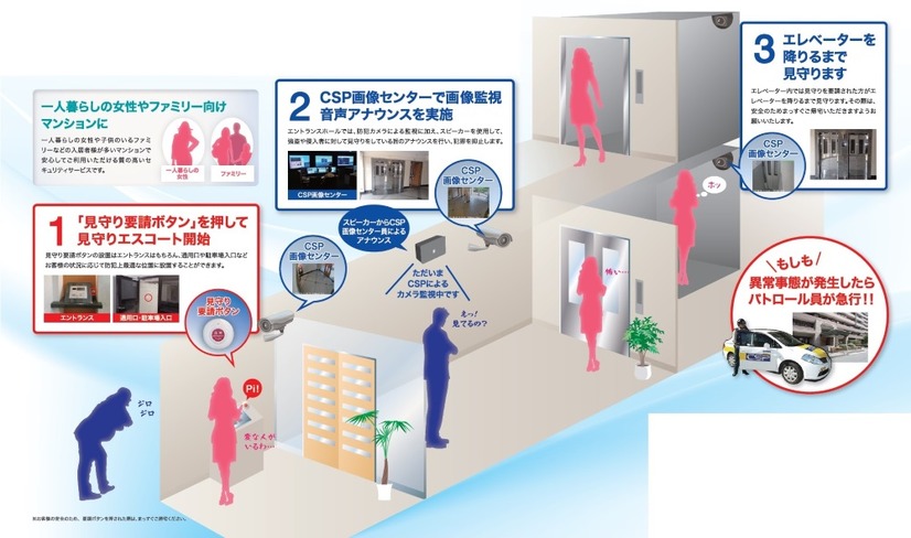 セントラル警備保障(CSP)は29日、「見守りエスコート」を10月下旬から開始することを発表した。マンション共用部向けのセキュリティサービスで、ストーカーや不審者などによる待ち伏せ被害などを防ぐことを目的としている。