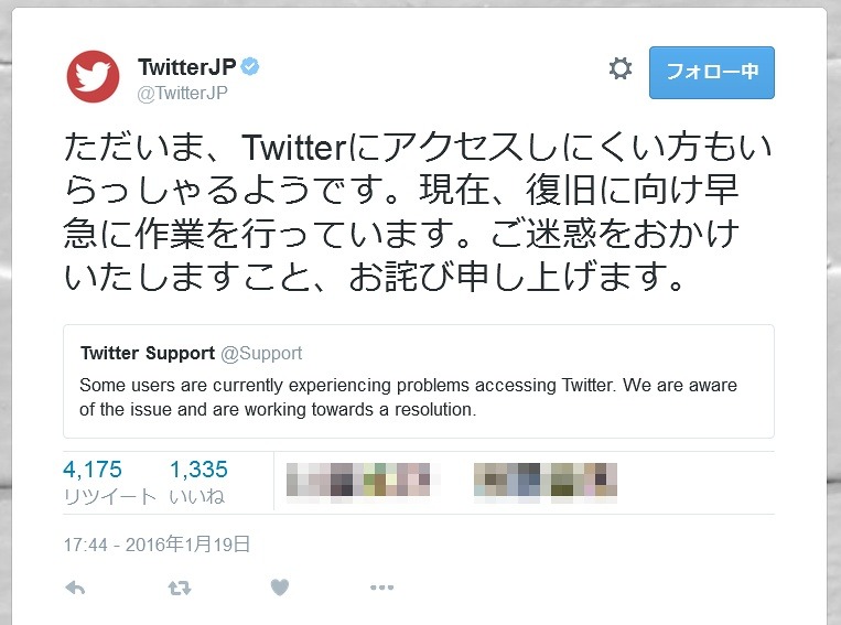 19日夕方ごろより、全世界的にTwitterにアクセスしにくい状況が発生。翌20日に「コード変更」が原因だったことがあきらかにされた。