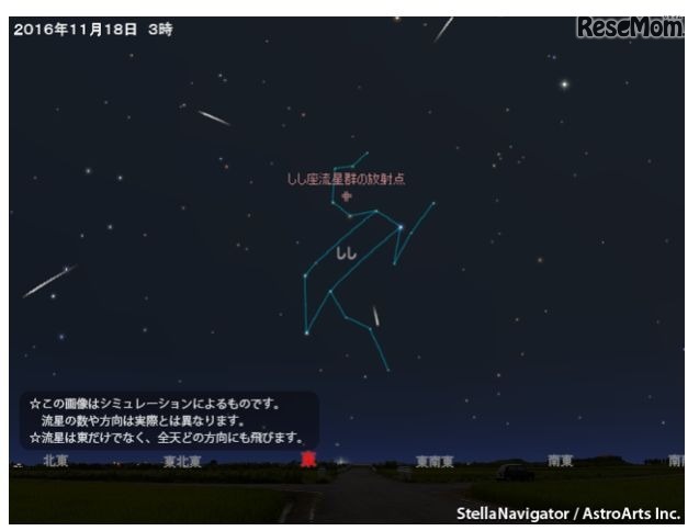 しし座流星群が11月17日に活動のピークを迎え、数が一番増えるのはしし座が昇る18日未明。気象庁の天気予報では晴れの地域が多いが、満月を過ぎた月が夜空を照らすため、見えにくいことが予想される。流星は東方向だけでなく全天に飛ぶ。