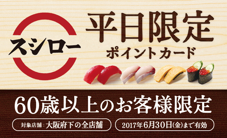 回転寿司チェーンのスシローは、本日8日から6月30日までの期間中、大阪府内の全45店舗にて、60歳以上の顧客に向け、シニア対象「平日限定ポイントカード」のサービスを開始すると発表した。
