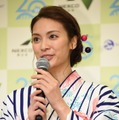 秋元才加が2日、「東京湾アクアライン 20周年記念企画 記者発表会」にタレントの小泉みゆきと浴衣姿で登場した。