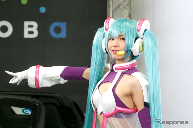 ドワンゴと本田技研工業の共同プロジェクト「osoba」のブースに、人気コスプレイヤーえなこが登場。「To LOVEる」などの漫画で知られる有名漫画家・矢吹健太朗がデザインした初音ミクの衣装で撮影会を行った。