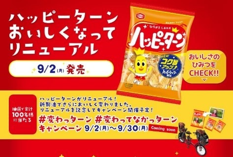 亀田製菓は、9月2日より「ハッピーターン」を4年ぶりにリニューアルして発売する。