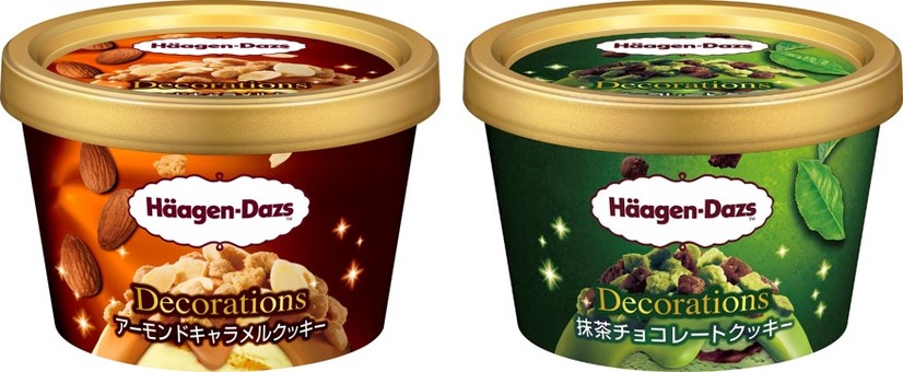 ハーゲンダッツは、ミニカップ Decorationsシリーズから「アーモンドキャラメルクッキー」「抹茶チョコレートクッキー」を3月23日から期間限定で販売する。