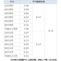 睡眠アプリの統計調査|年代ごとの平均睡眠時間(2018年11月度)