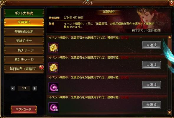 イベント期間中、1日の「光翼星石」の使用個数が条件を満たすと報酬が獲得できます。150個以上使用すると、聖器【アテナの盾の破片】がもらえます。破片を20個集めることで、【アテナの盾】が開放できます