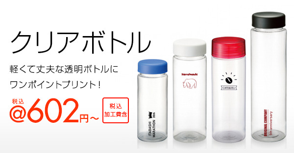 話題のクリアボトルに、ワンポイントプリントでオリジナルボトルを作成できます。