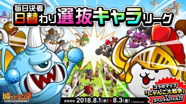 株式会社アソビズム(本社:東京都千代田区、代表取締役:大手智之)は、App Store・Google Playにて好評配信中の『城とドラゴン』で、2018年8月1日(水)より「毎日決着リーグ」および「日替わり選抜キャラリーグ」を開催いたします。毎日選抜キャラを確認し、お気に入りのキャラでランキング上位を目指しましょう!