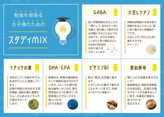 有機Bio認証取得のオルゾモンドをはじめ、GABA、大豆レシチン、イチョウの葉、DHA、EPA、ビタミンB1、亜鉛酵母を贅沢にブレンドした、独自の「スタディMIX」仕様。