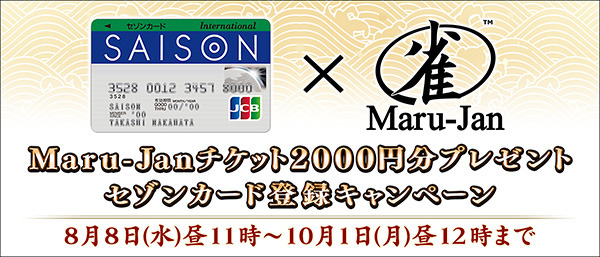 Maru-Jan公式サイト内のキャンペーンページまたは会員向けメルマガを経由して、新規にセゾンカード会員に登録し、カードが発行された方全員に、Maru-Janを2000円分無料でプレイできるMaru-Janチケットをプレゼント。