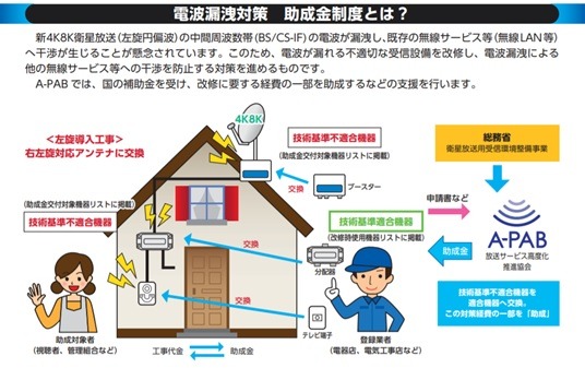 このため、不適切な受信設備を改修し、対策を進めるために、一般社団法人放送サービス高度化推進協会(A-PAB)が国の補助金を受け、助成支援を行っております。