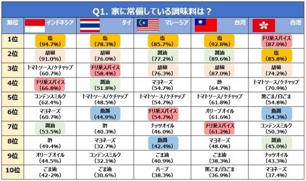 アジア5カ国のうち、香港を除くすべてで「塩」がNo.1という結果になりました。やはり基本調味料である塩は、日本と同じく多くの家庭に常備されているようです。